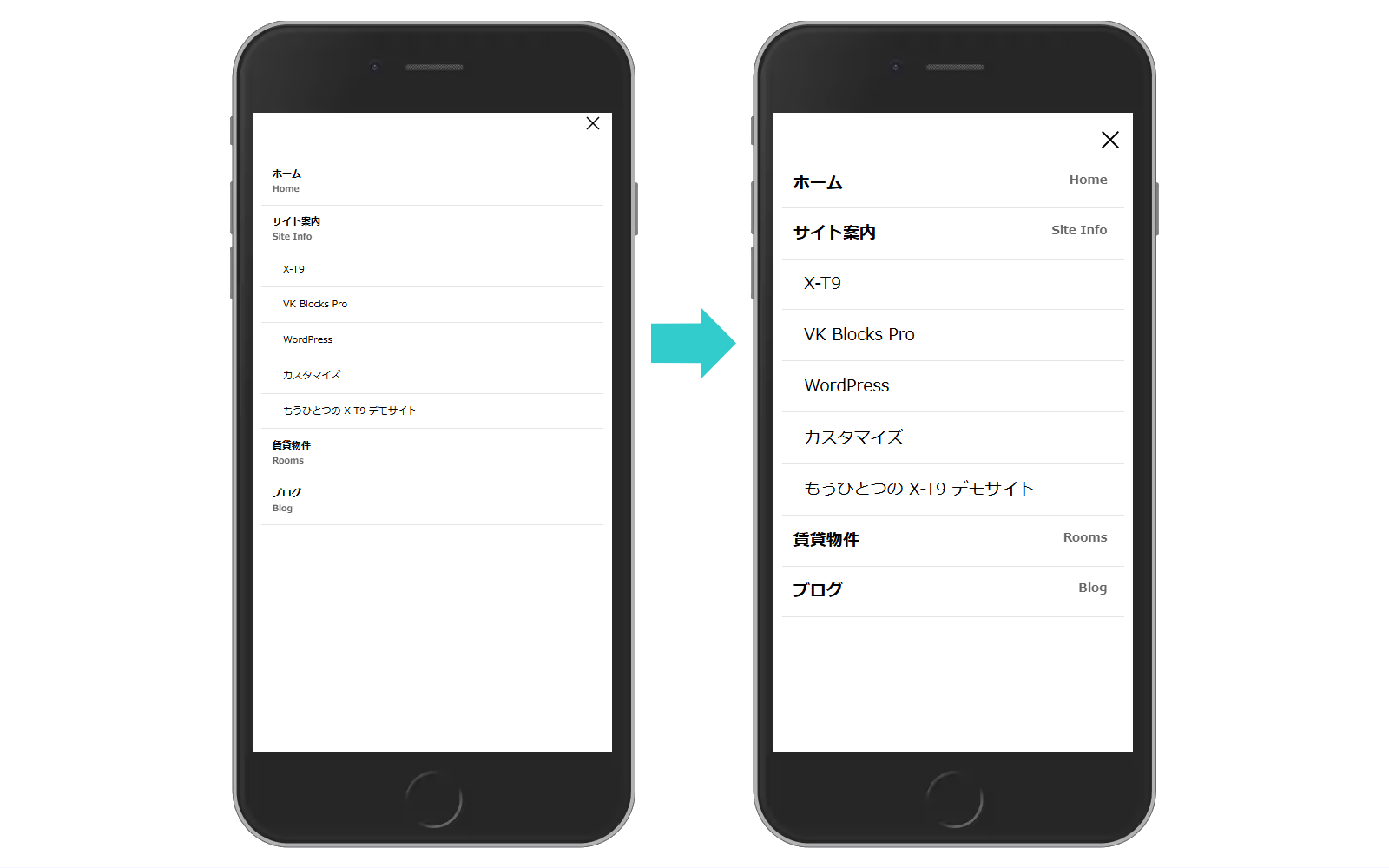 X-T9 のデフォルトのブログページをスマホで表示するとこのようになっています。